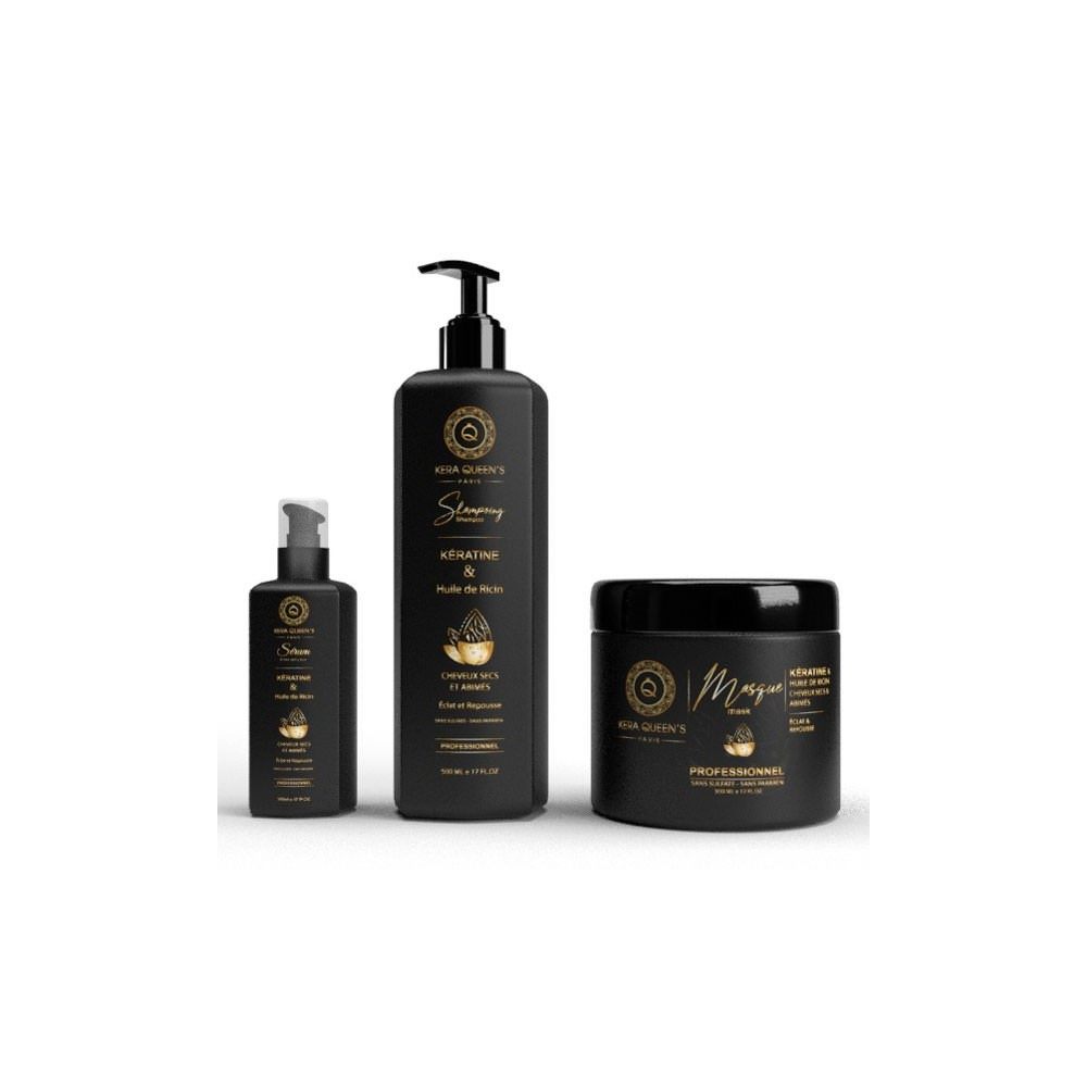 SHAMPOING Kera Queen, appliquer ce shampoing à base de kératine et d’huile de ricin sur cheveux mouillés. Il vous suffit ensuite de faire mousser en massant le cuir chevelu puis de rincer abondamment.