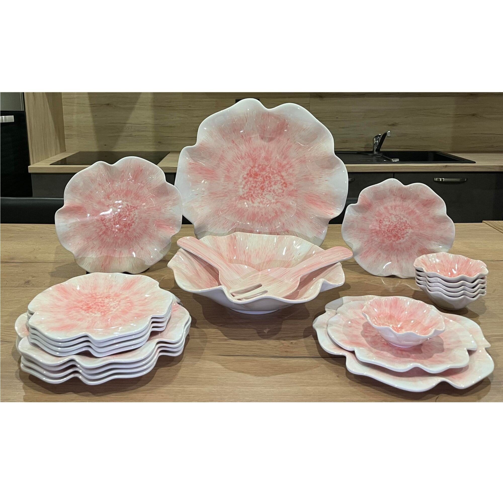 Service vaisselle en Mélamine fleur rose. Elégant et léger pour une table raffinée.
